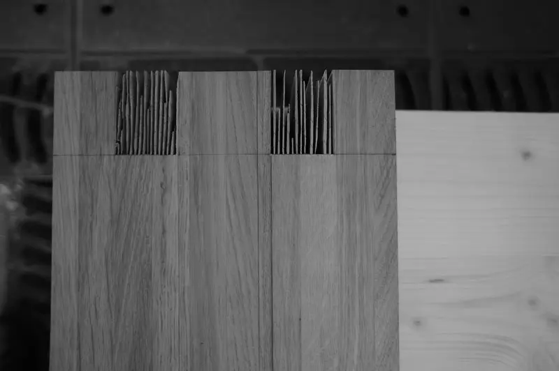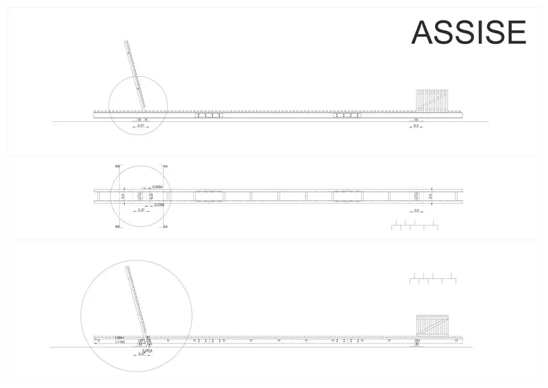 Sur un socle de métal brut sont fixés des tasseaux de bois de sapin profilés. Trois marches permettent l’accès à ces chemins en équilibre qui proposent des passages d’une extrémité à l’autre contant le paysage quotidien.