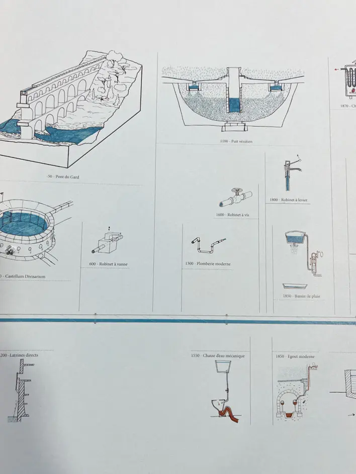 L’agriculture, les villages, les villes, les métropoles se sont structurés e, ceci grâce à des systèmes comme des réservoirs, citernes, aqueducs, canaux…De très nombreux dispositifs architectoniques ont été élaborés pour capter ou rejeter l’eau mais toujours d’après l’eau –, les corniches, génoises, chéneaux, gouttières, acrotère, rejingots, et autres parements de façade, sont autant d’éléments qui constituent ce avec quoi se fabrique l’architecture.