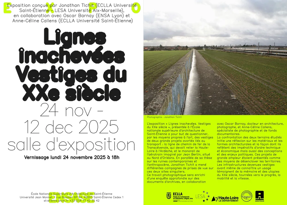 L’exposition « Lignes inachevées. Vestiges du XXe siècle », présentée à l’ENSASE a pour but de questionner, par les moyens propres à l’art, des vestiges de deux grands projets avortés liés au transport : la ligne de chemin de fer de la Transcévenole, qui devait relier la Haute-Loire à l’Ardèche, et le monorail de l’aérotrain imaginé par Jean Bertin, situé au Nord d’Orléans. En parallèle de sa thèse sur les ruines contemporaines et l’anthropocène, Jonathan Tichit a mené différentes campagnes de prises de vue sur ces deux sites singuliers.
