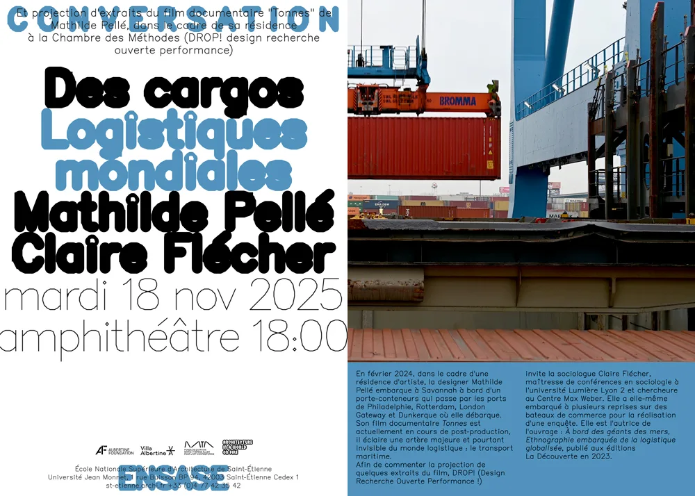 Afin de commenter la projection de quelques extraits du film, DROP! (Design Recherche Ouverte Performance !) invite la sociologue Claire Flécher, maîtresse de conférences en sociologie à l’université Lumière Lyon 2 et chercheure au Centre Max Weber. Elle a elle-même embarqué à plusieurs reprises sur des bateaux de commerce pour la réalisation d’une enquête. Elle est l’autrice de l’ouvrage : À bord des géants des mers, Ethnographie embarquée de la logistique globalisée, publié aux éditions