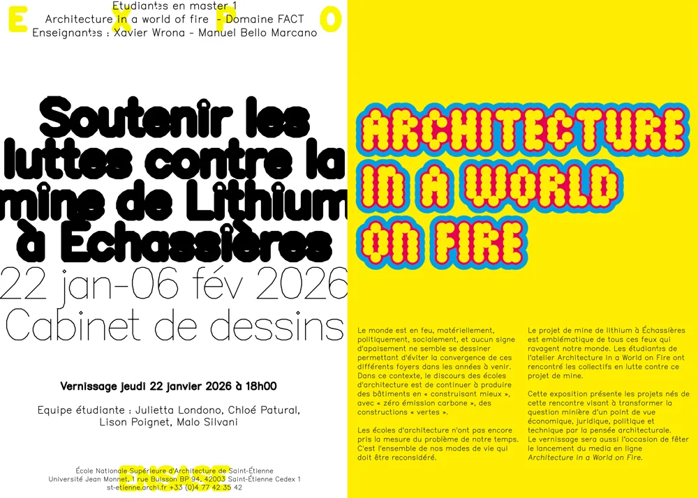 Les écoles d’architecture n’ont pas encore pris la mesure du problème de notre temps. C’est l’ensemble de nos modes de vie qui doit être reconsidéré. Le projet de mine de lithium à Échassières est emblématique de tous ces feux qui ravagent notre monde. Les étudiant·es de l’atelier Architecture in a World on Fire ont rencontré les collectifs en lutte contre ce projet de mine.